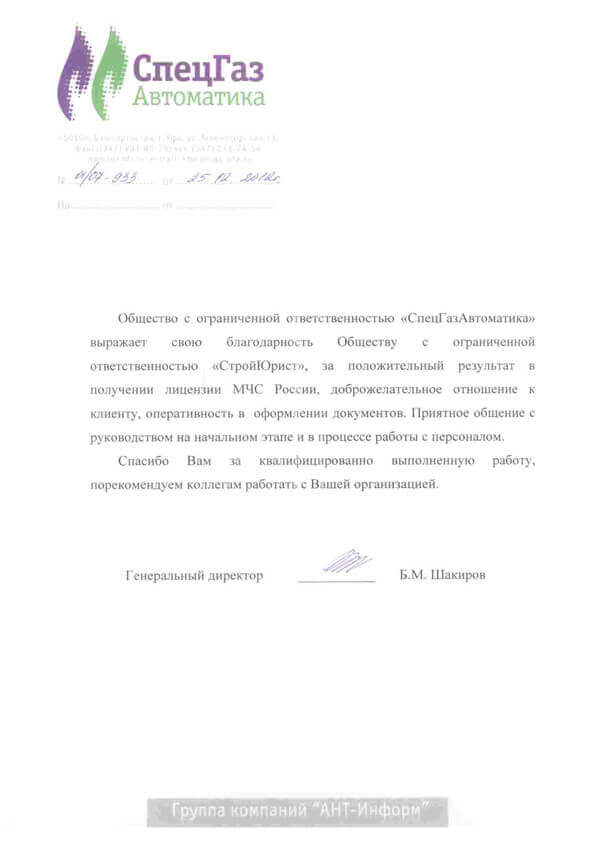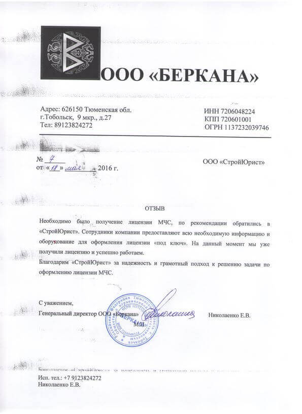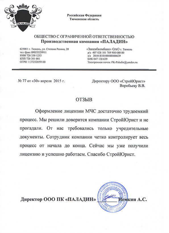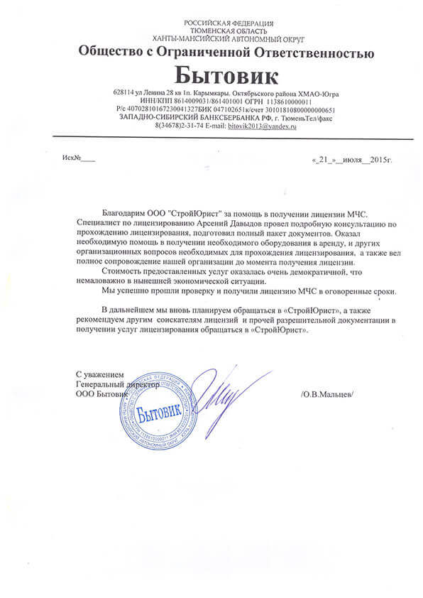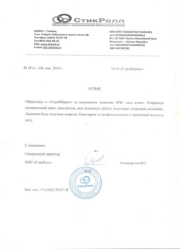 Отзывы клиентов "СтройЮрист" по лицензированию МЧС